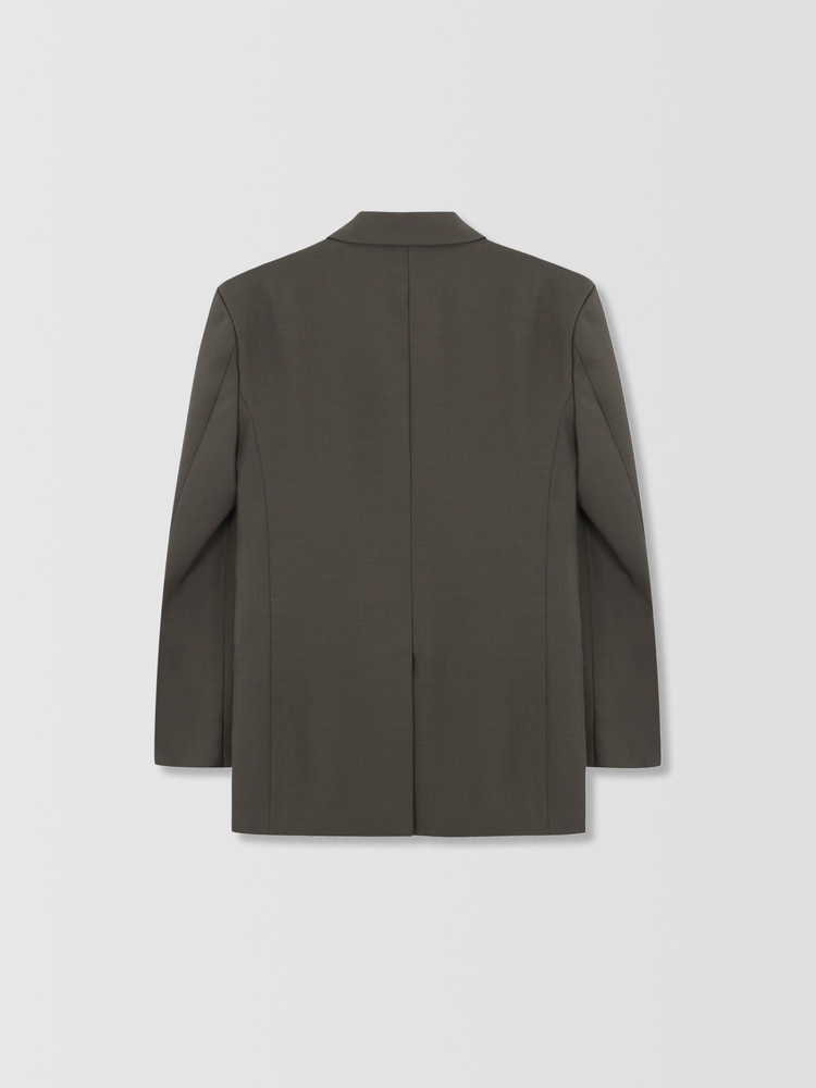 루즈한 핏과 직선적인 어깨 라인이 돋보이는 더블 브레스티드 자켓입니다.